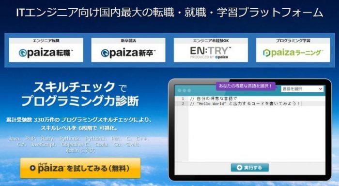 paiza転職はIT・Webエンジニア向けのプログラミング転職サイトです。コーディングを行いスキルチェックが出来るだけではなく、必要なランクを満たせば書類選考なしで面接に進むことができます。コーディング力には自信があるという人には一押しの転職サイトです。